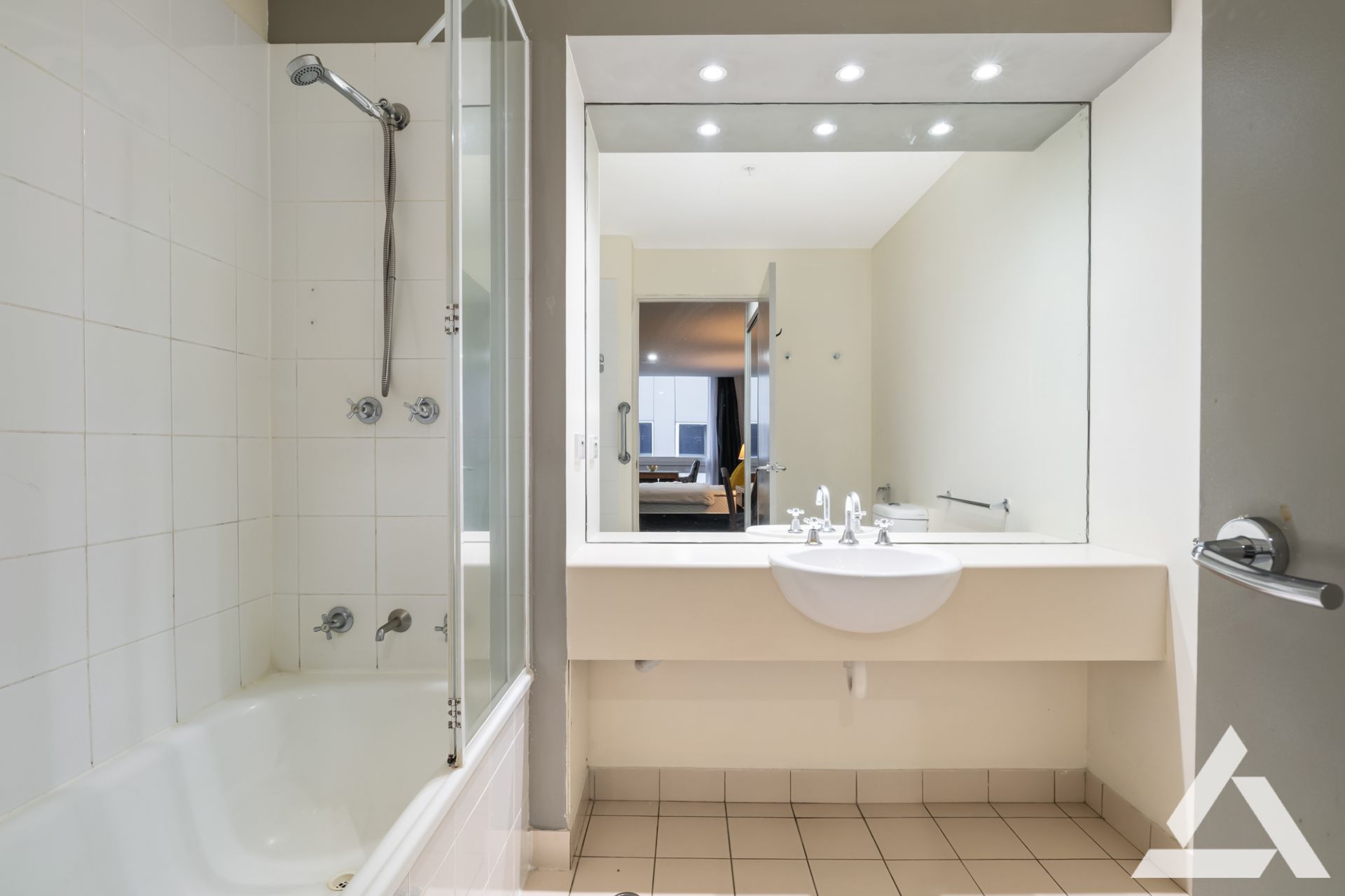 Located within a secure building, the apartment features a light-filled open-plan living and bedroom space, a sleek bathroom with bath, and a compact kitchenette ideal for simple meals.