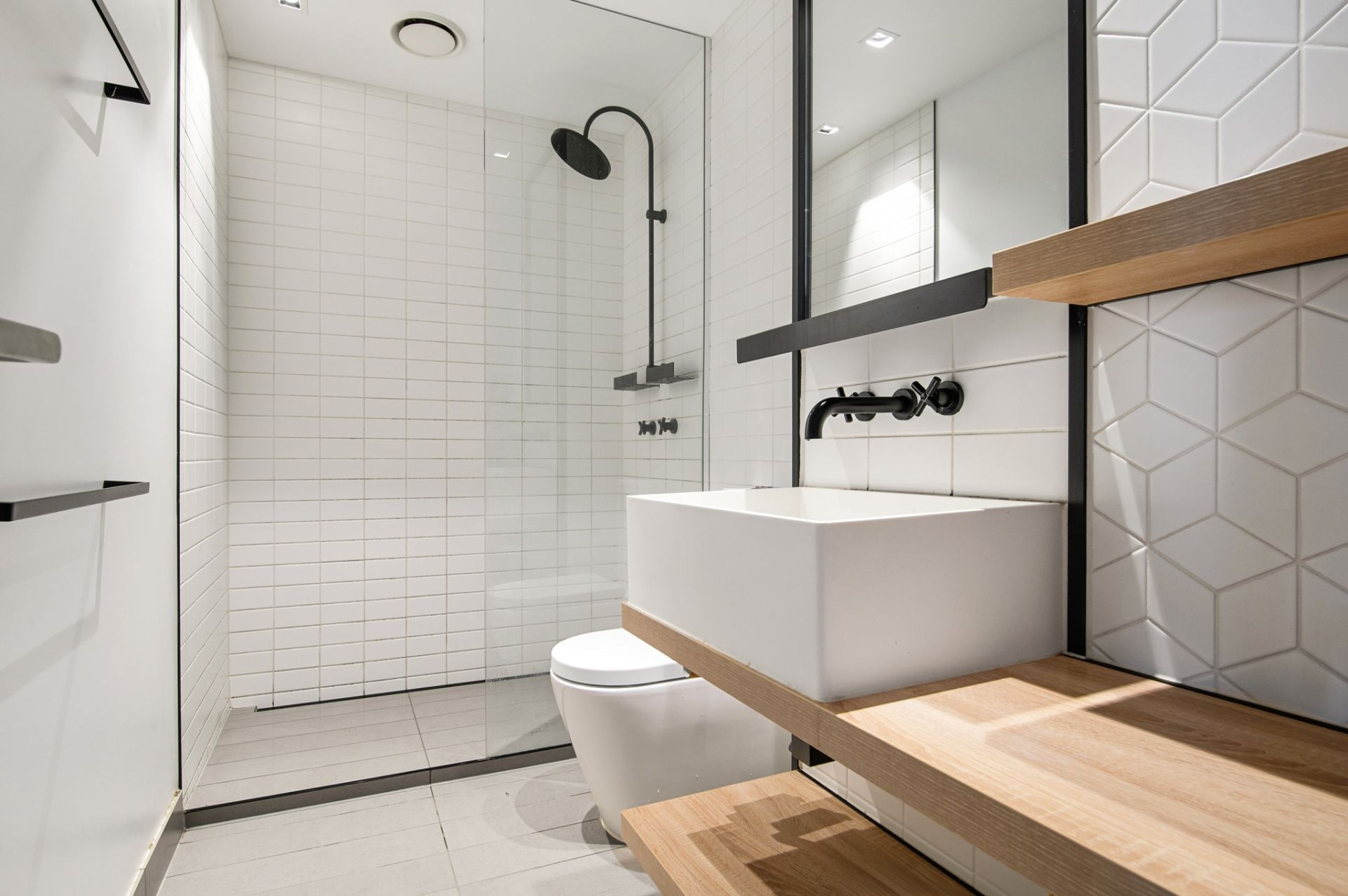 • Scandinavian styled bathroom featuring trendy timber finishes