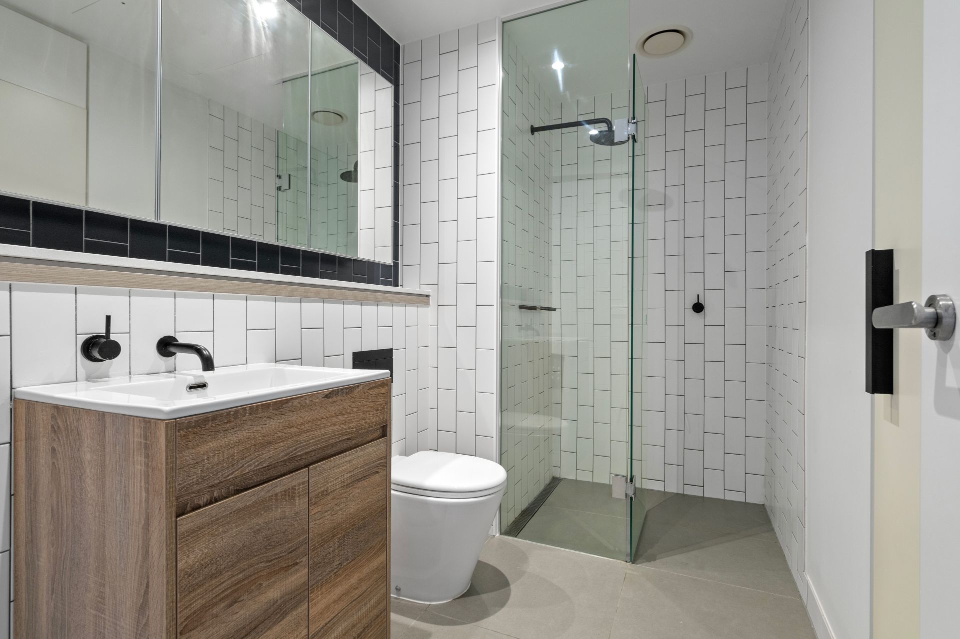 • Vertical subway tiling and a rain shower define the luxe bathroom