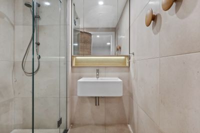 • Sleek bathroom with floor-to-ceiling tiling