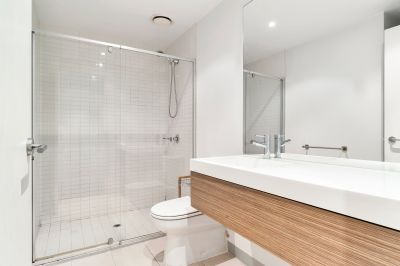 • Sleek bathroom that has a tiled walk-in shower and laundry facilities